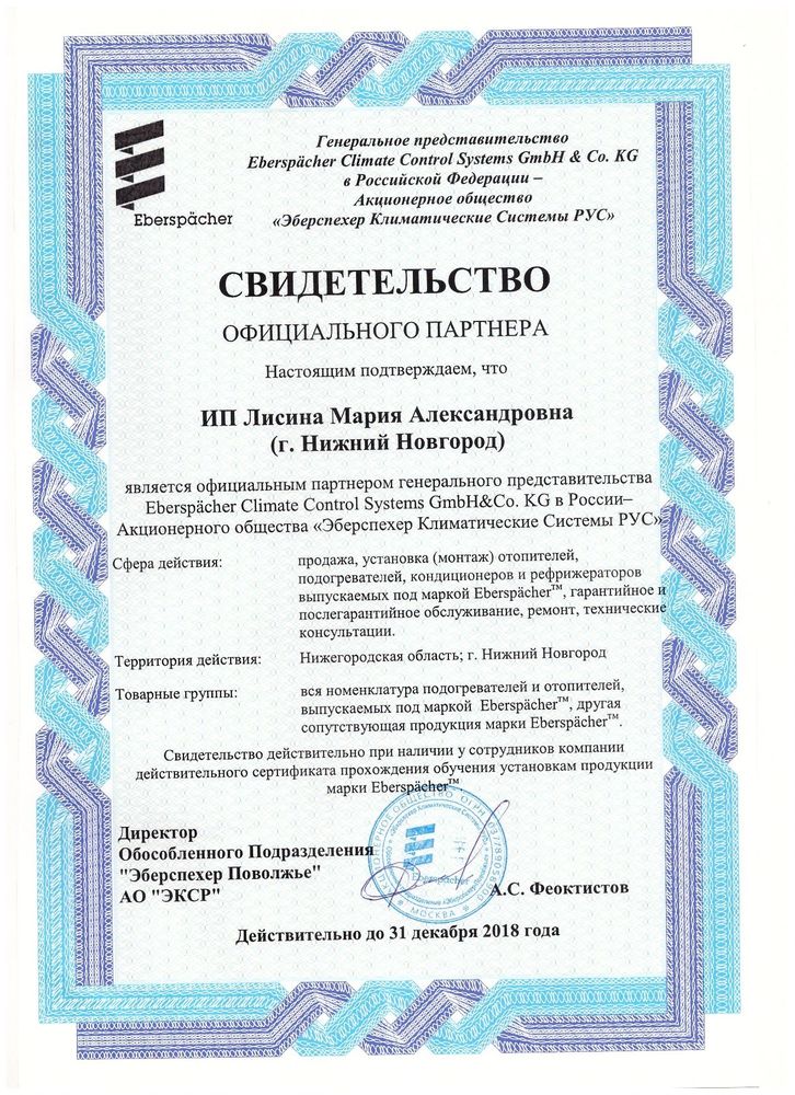 Гарантия установочных центров "Eberspacher".