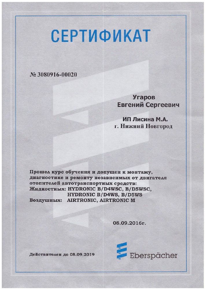 Благодаря многолетнему опыту, знанию теоретических и практических сторон вопросов, которые относятся к специфике индивидуального устройства каждого автомобиля, а также следуя исключительно нормативам и рекомендациям компании Eberspacher, мы можем гарантировать безопасность установки оборудования на Ваш автомобиль и качество наших работ.